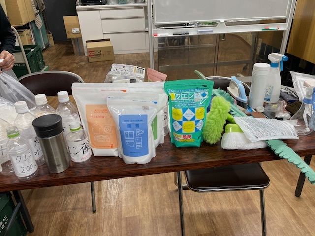 はじめに、水環境や水の循環などについてクイズを入れながら説明があり、次に汚れを落とす方法としての「中和」について説明がありました。それらの基本の考え方をふまえたところで、掃除の仕方、道具の紹介にうつり、たくさんの掃除道具を並べて、紹介がありました。お風呂洗いの柄付きスポンジ、ふわふわ網戸スポンジ、排水口用の柄付きギザギザスポンジ、合体お風呂ブラシなどなど、きららさんが使った感想なども説明があり、とてもわかりやすい講座でした。