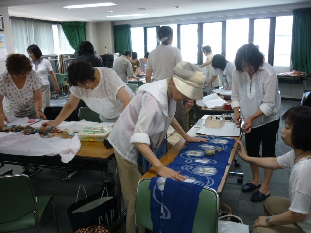 参加者が持参した着物地や洋服地の布は、黒や小紋の着物あり、薄く透ける夏の絽の着物あり、紬あり。模様も大柄な模様から小花模様まであり、華やかで楽しい雰囲気が漂いました。
