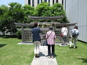 その後も豊岩稲荷、三輪神社、あづま稲荷神社(恵比寿)、銀座出世地蔵尊(布袋尊)と三囲神社と廻ります。最後は松屋通りにある朝日稲荷神社(毘沙門天)。地上にあるのは拝殿で本殿はビルの屋上にあるとのこと、全員で屋上に上り本殿にしっかりお参りして銀座神社巡りは終了しました。